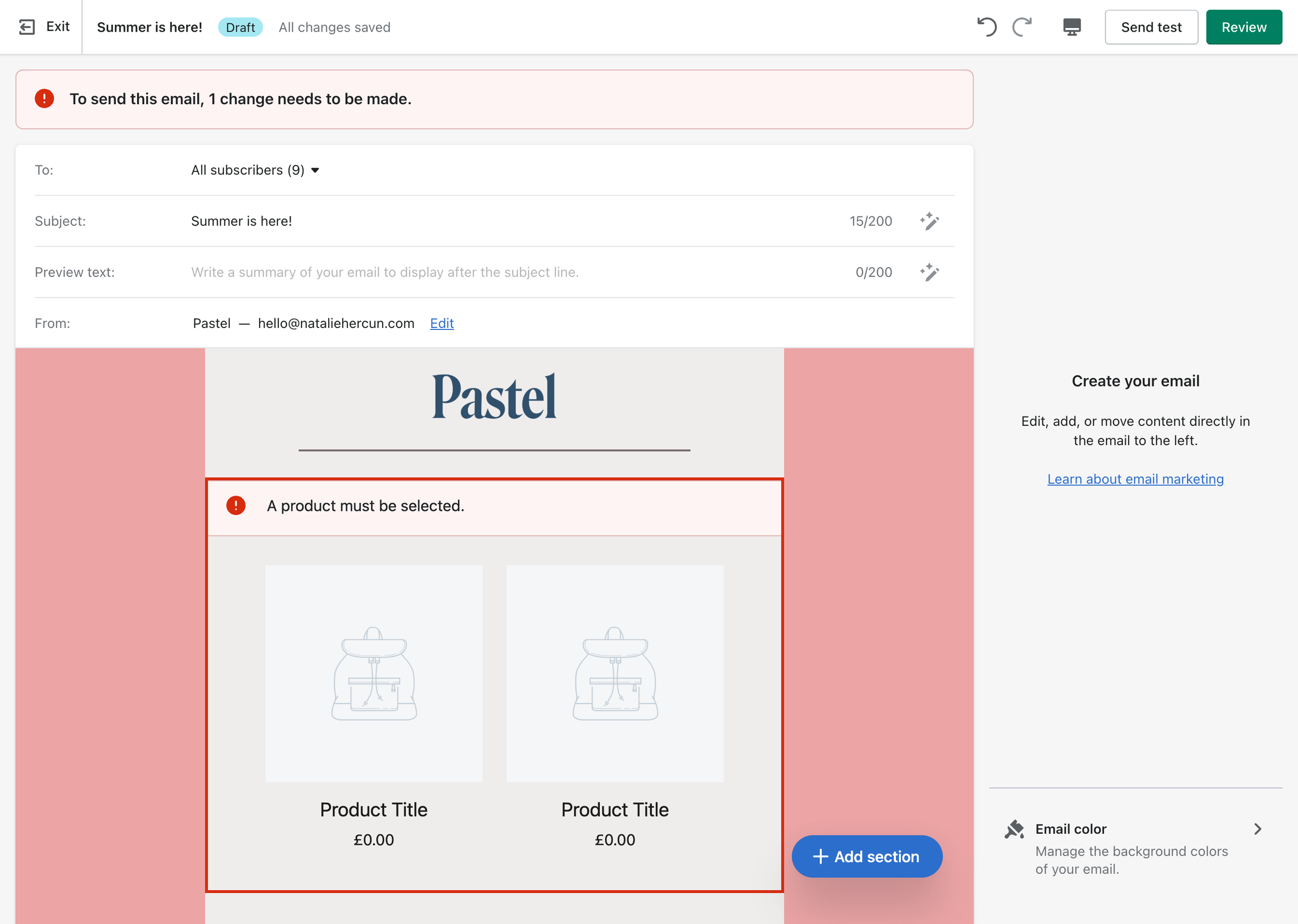 Three new editing options were being added to Shopify Email, targeting users new to email marketing, who might lack the resources for advanced editing power tools, such as Photoshop. Our goal was to improve the aesthetic appeal of emails sent through Shopify Email, and as a result, improve conversions.