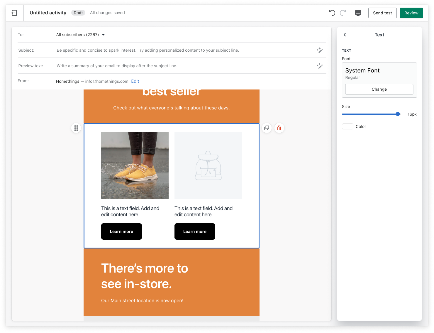 Our labels were made more precise and concise with a new approach to labeling. This approach takes into consideration accessibility, internationalization (right to left languages in particular for multicolumn), and pre-existing mental models both within Shopify and the wider world of email marketing and marketing design tools.
