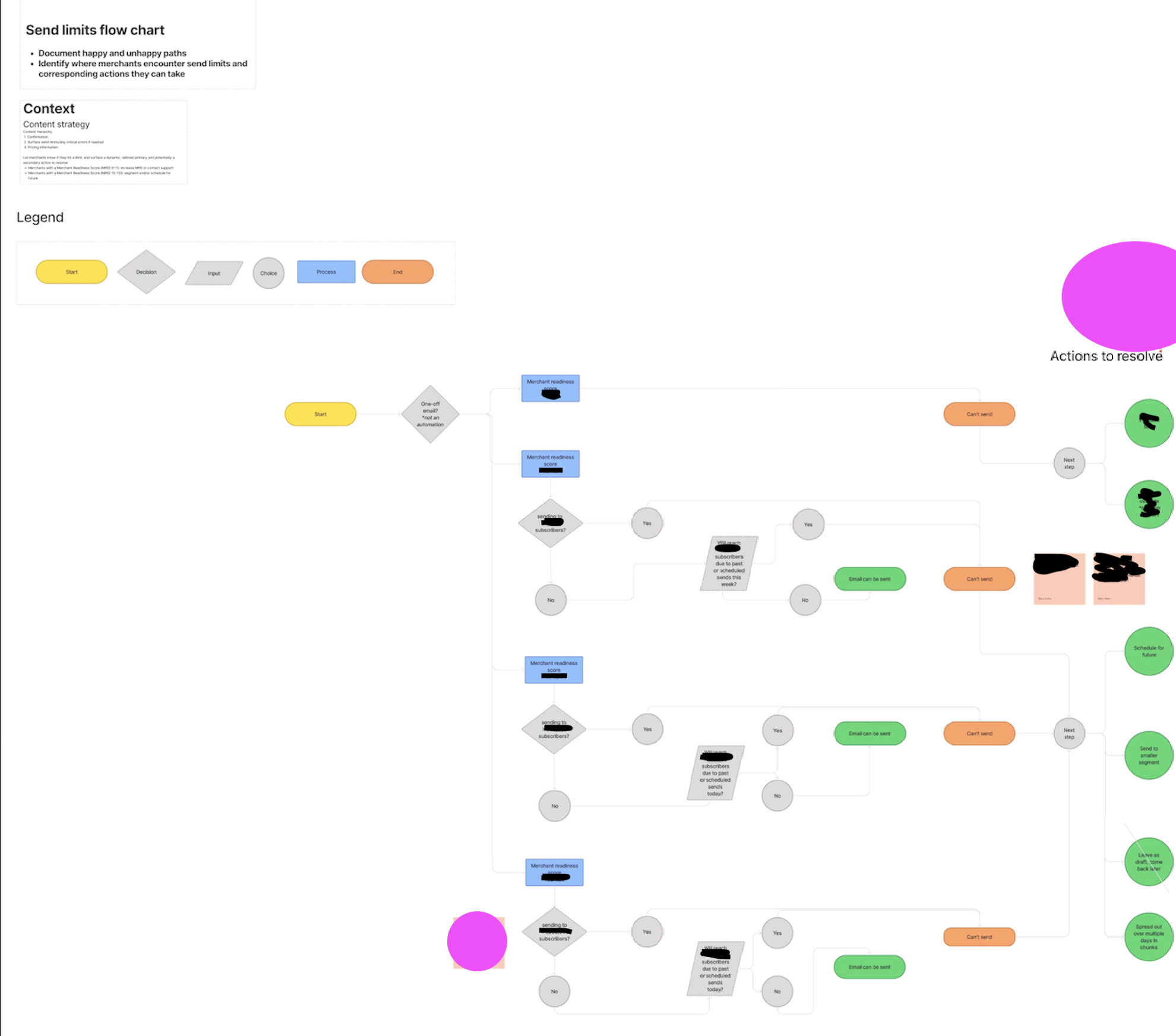 To facilitate decision making on the updated email limits, I paired with engineering and data to gather context, and put together this flow chart to illustrate the email limits experience. All of our stakeholders were able to come collaborate in this Figjam during working sessions and understand the current limits, and the proposed limits and resolutions.